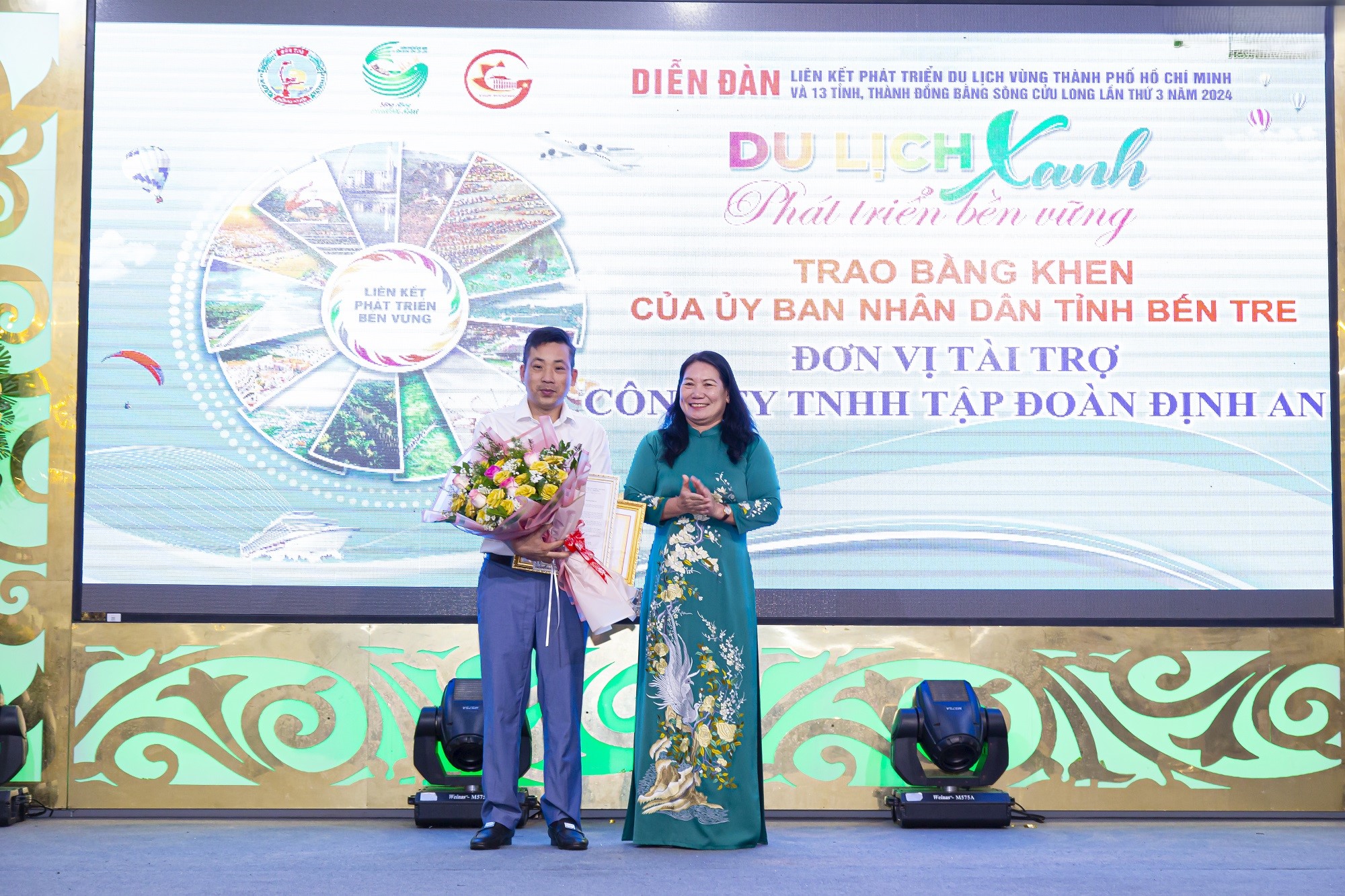 Cũng trong khuôn khổ chương trình, Ông Nguyễn Hồng Quang – Tổng Giám đốc tập đoàn Ruby chia sẻ: Tập đoàn Định An xin hứa sẽ tiếp tục đồng hành cùng với tỉnh Bến Tre không chỉ ở Diễn đàn ngày hôm nay mà bằng kinh nghiệm, kiến thức của lĩnh vực kinh doanh của Tập đoàn hiện tại để phối hợp cùng 13 tỉnh thành đồng bằng Sông Cửu Long nói chung và tỉnh Bến Tre nói riêng tiếp tục thực hiện đồng hành phát triển kinh tế – xã hội, trong đó có du lịch.